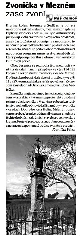 Měsíčník Můj Domov uvádí: "Zvonička v Mezném opět zvon." Typ: JPG obrázek, Velikost: 156.65 kB