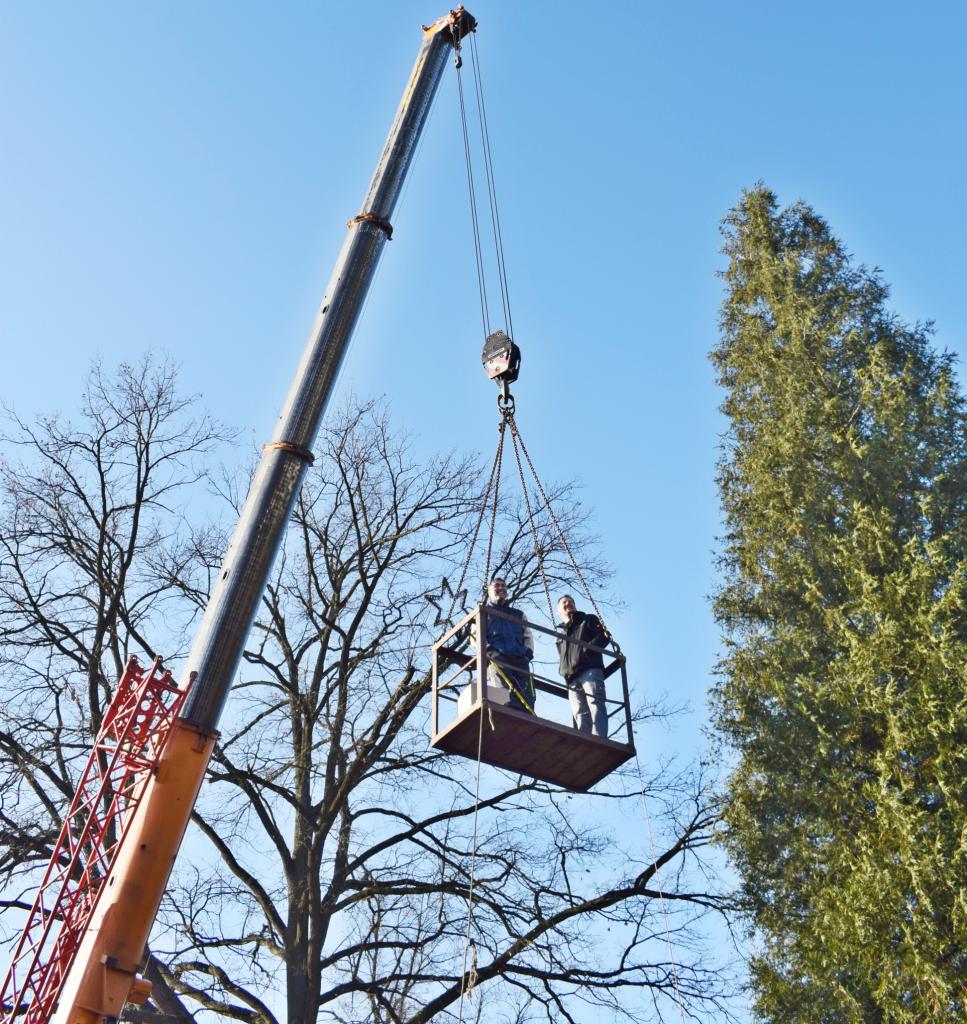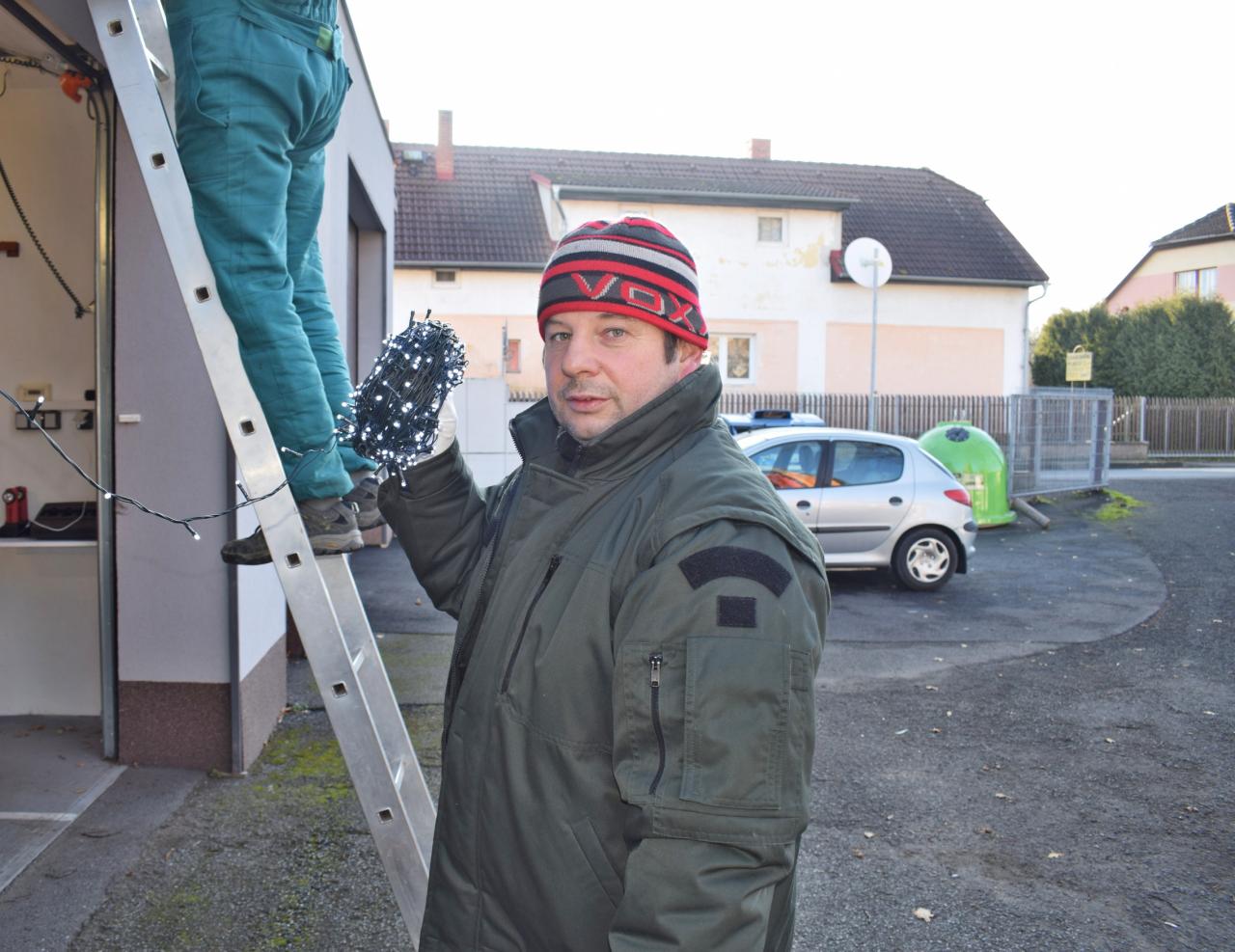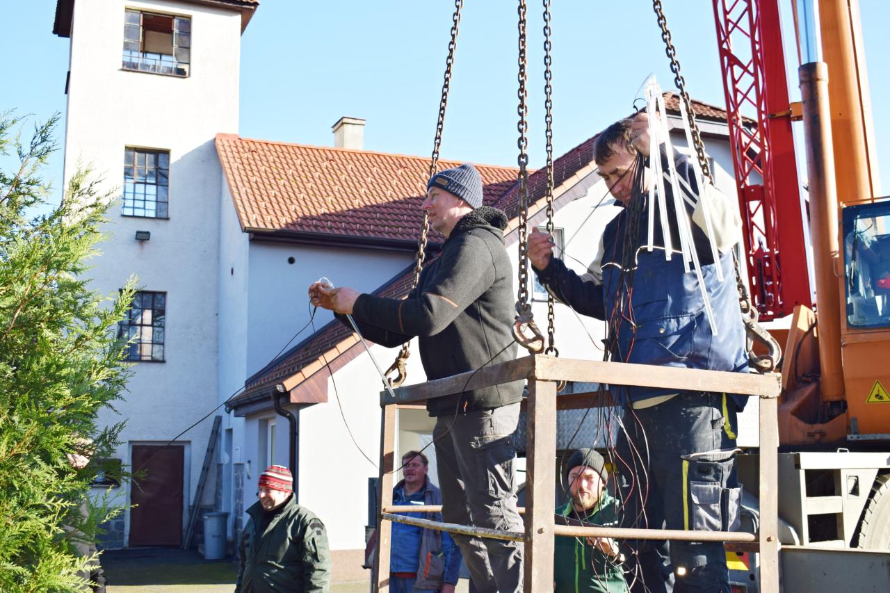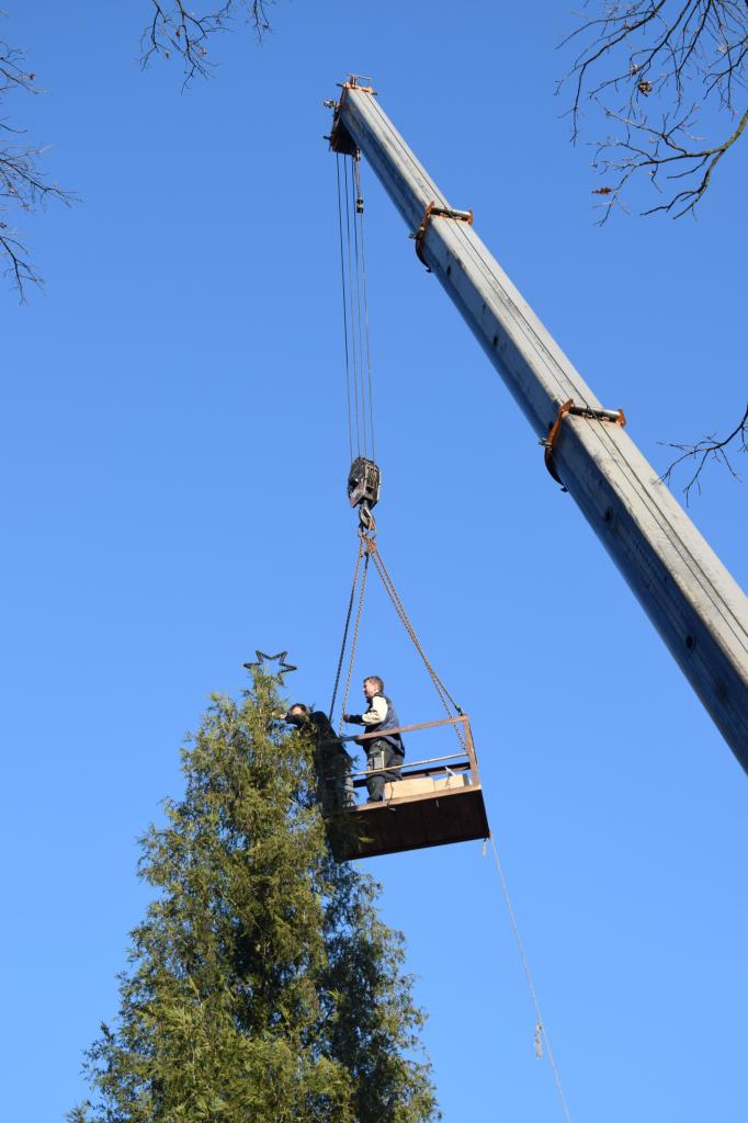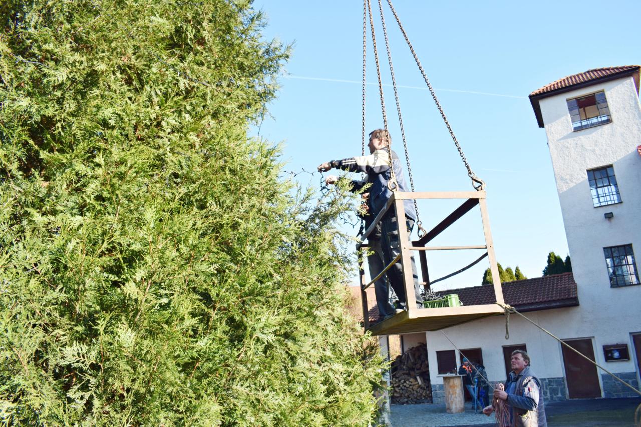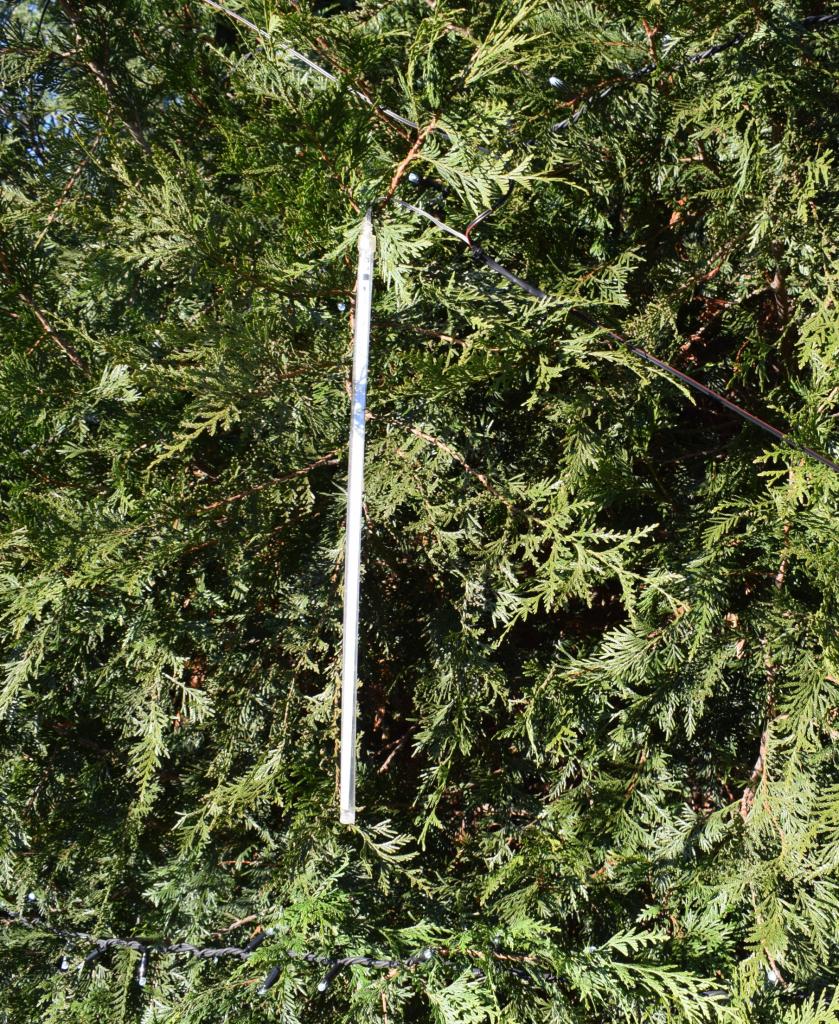 Vánoční strom. Výzdoba dvacetimetrové túje v obecním parku u hasičské zbrojnice - svítící vrcholová hvězda, světelné řetězy, a rampouchy. 30.11.2024