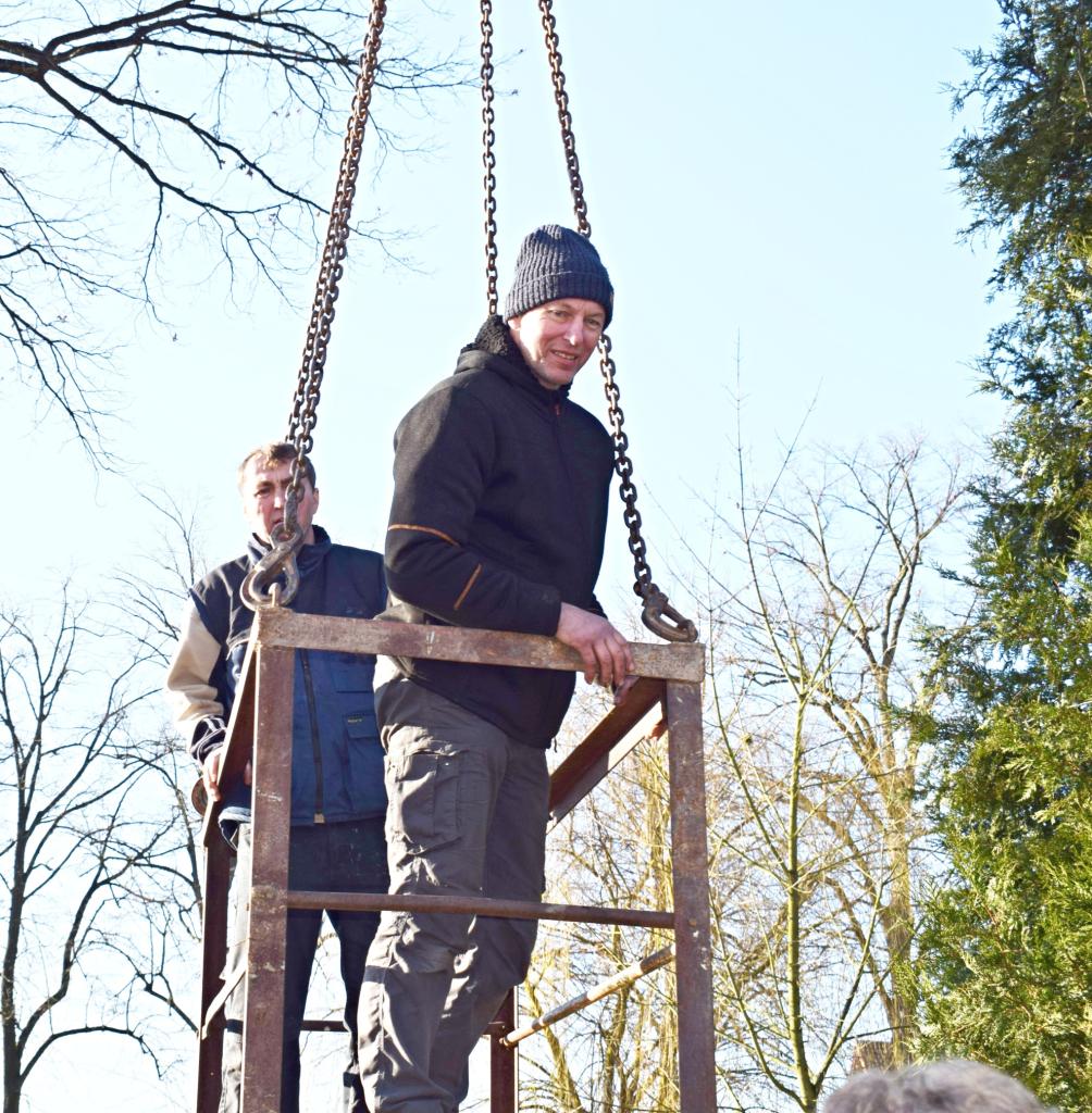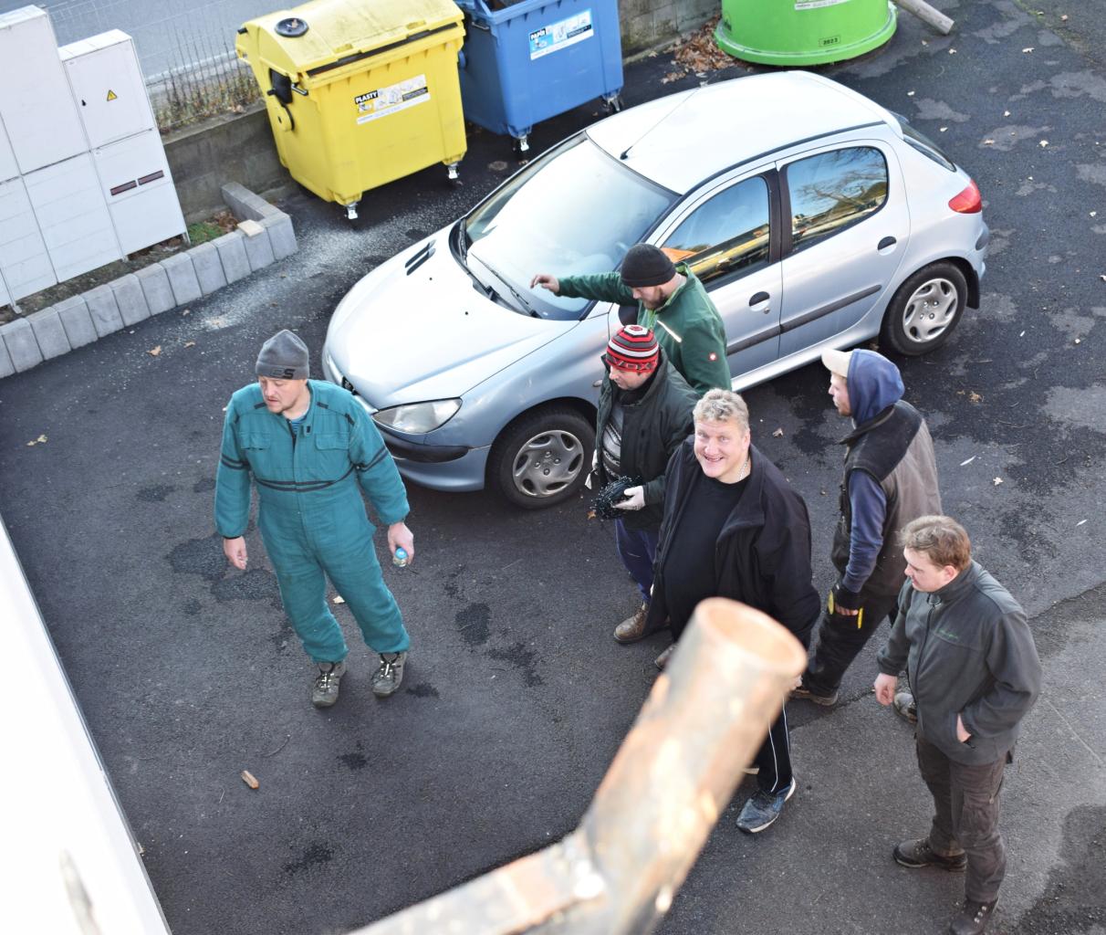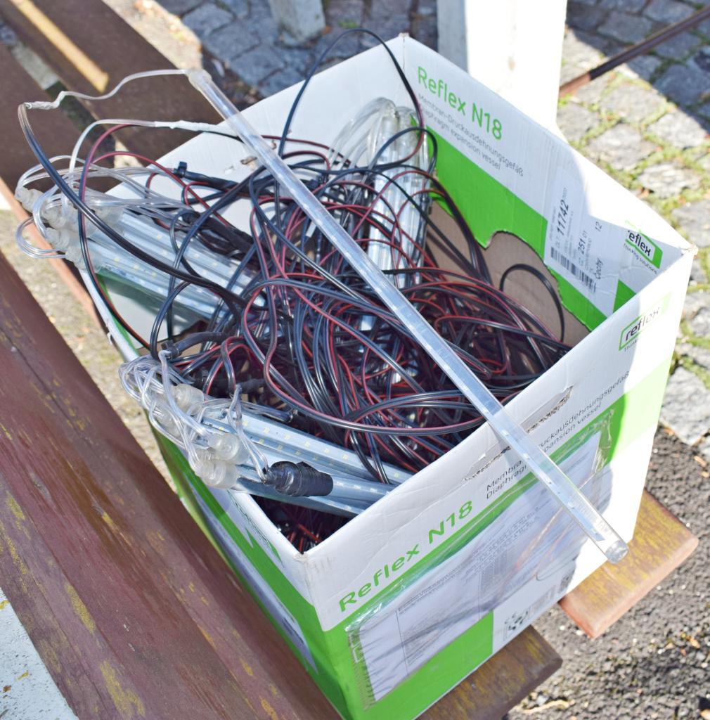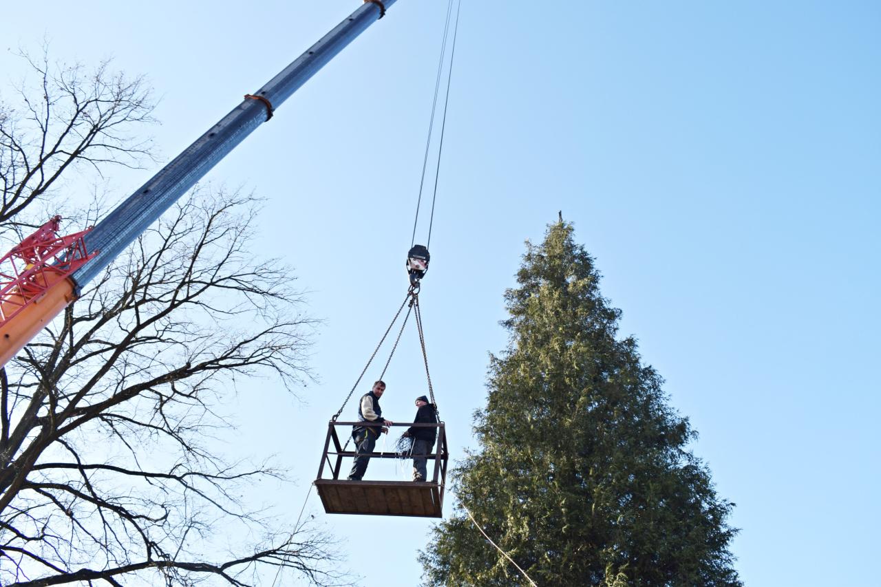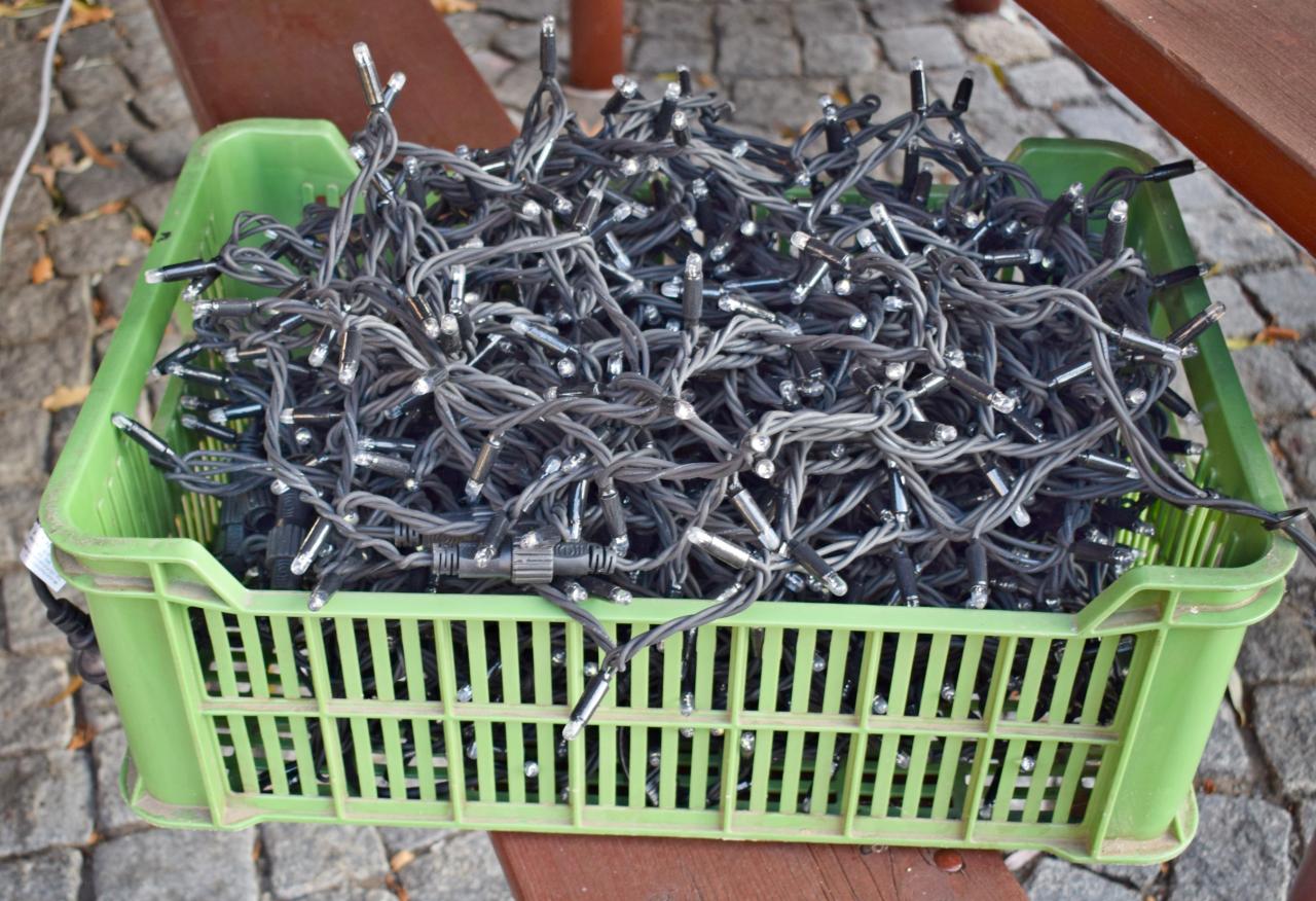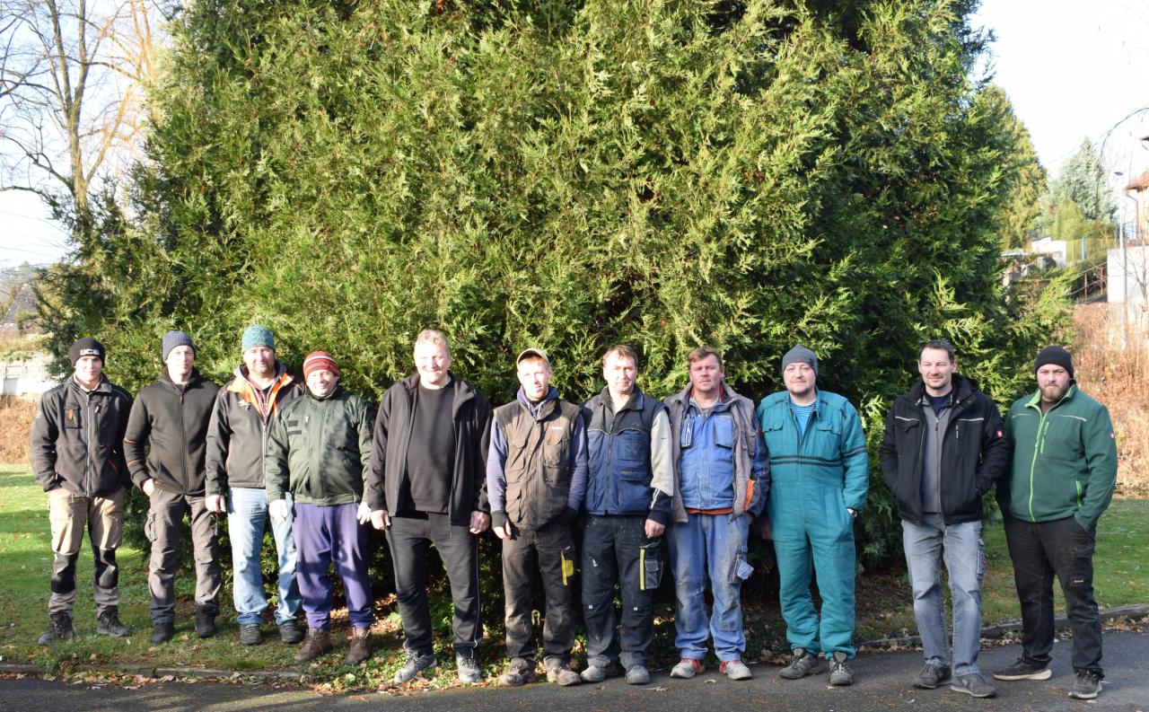 Vánoční strom. Výzdoba dvacetimetrové túje v obecním parku u hasičské zbrojnice - svítící vrcholová hvězda, světelné řetězy, a rampouchy. 30.11.2024