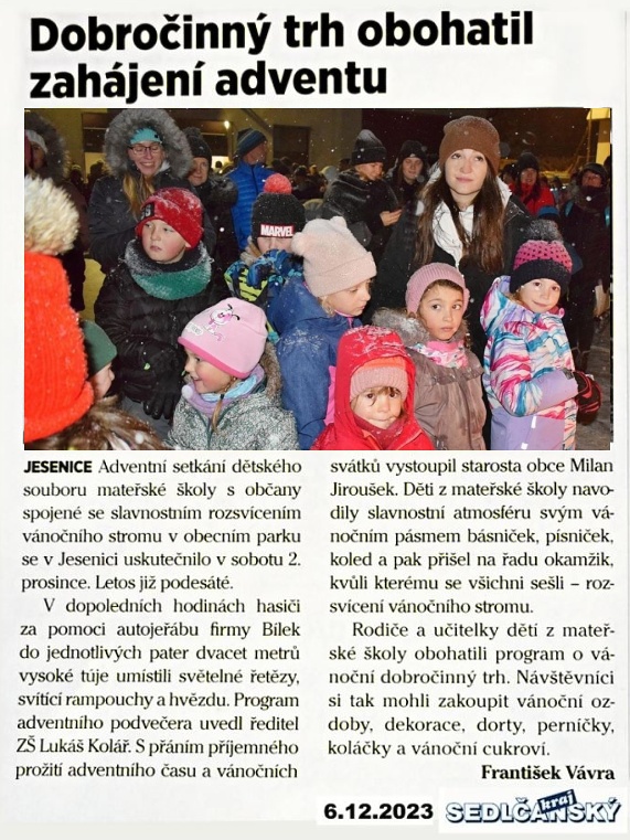 SEDLČANSKÝ KRAJ uvádí článek: "Dobročinný trh obohatil zahájení adventu."6.12.2023 Typ: JPG obrázek, Velikost: 237.08 kB
